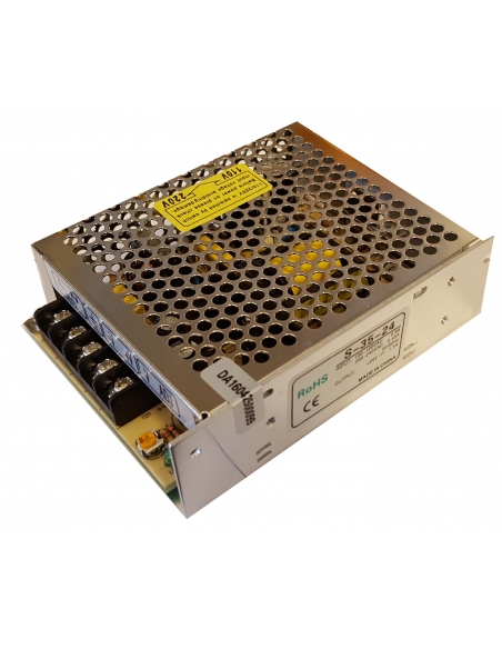 Stabilized industrial power supply, single output of 24Vdc, 1.5A., Switched type of 35W of power. 230Vac power supply, protected against overloads and short circuit Metal box for industrial use, for mounting on a panel bottom using screws. High performance and reliability that are required in industrial use.